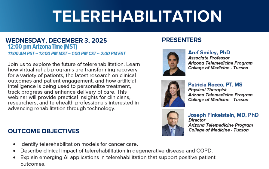 Join us to explore the future of telerehabilitation. Learn how virtual rehab programs are transforming recovery for a variety of patients, the latest research on clinical outcomes and patient engagement, and how artificial intelligences is being used to personalize treatment, track progress and enhance delivery of care. This webinar will provide practical insights for clinicians, researchers, and telehealth professionals interested in advancing rehabilitation through technology.